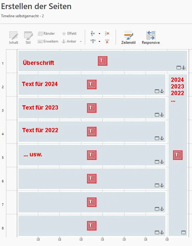 Damit die Jahreszahl beim Klicken auf die Ankerlinks im rechten schmalen Text-Objekt nicht durch die StickyBar verdeckt wird, können in den breiten Text-Objekten über der Jahreszahl noch 2 Leerzeilen eingefügt werden.