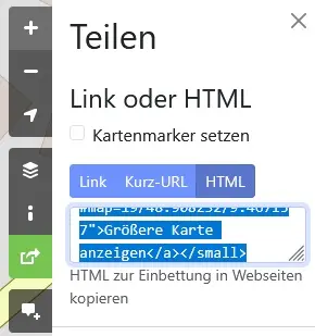 2) Rechts am Rand auf "Teilen" klicken und dann auf "HTML", jetzt den blaumarkierten Code im kleinen Fenster mit Strg + C kopieren.