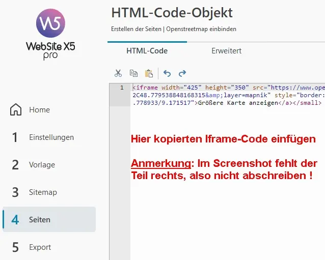 4) Den kopierten Code mit Strg + V ins Objekt "HTML Code" einfügen.