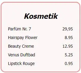 Im HTML-Objekt wird dieser Code unter "HTML-Code" eingefügt:Einfache Speisekarte<dl><dt>Salmon Ravioli</dt><dd>7.95</dd></dl><dl><dt>Fried Calamari</dt><dd>8.95</dd></dl><dl><dt>Almond Prawn Cocktail</dt><dd>12.95</dd></dl><dl><dt>Bruschetta</dt><dd>5.25</dd></dl><dl><dt>Margherita Pizza </dt><dd>0.95</dd></dl>Und diesen Code im gleichen HTML-Objekt unter "Erweitert":dl {overflow: hidden;font-weight: bold;margin: 12px;}dt {float: left;padding: 0 .4em 0 0;margin: 0;}dd {float: right;padding: 0 0 0 .4em;margin: 0;}/* That's the leader! */dl:after {content: "";display: block;overflow: hidden;height: 1em;border-bottom: 1px dotted;}