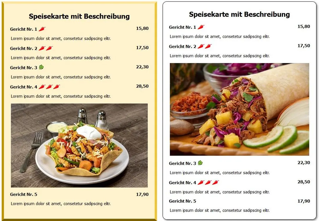 Diesen Abschnitt mit Beschreibung bei Bedarf um Code für Zeilenumbrüche und Bild erweitern, z.B. für Fotos der Gerichte.<dl><dt>Gericht Nr. 3</dt><dd>22,30</dd></dl><p class="menu-text">Lorem ipsum dolor sit amet, consetetur sadipscing elitr.<br><br><img src="images/menue123.jpg" width=100%"></p>Nach der Beschreibung den HTML-Code <br><br> für 2 Zeilenumbrüche und den IMG-Tag mit width="100%" für das Foto hinzufügen.