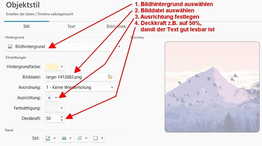 Gewünschte Text-Objekt im Raster markieren und oben auf "Stil" klicken, im Fenster "Objektstil" kann ein Hintergrundbild hinter dem Text eingefügt werden, dabei wird je nach Bildgröße und Einstellungen meistens nur ein Ausschnitt angezeigt, siehe Screenshot C ganz unten