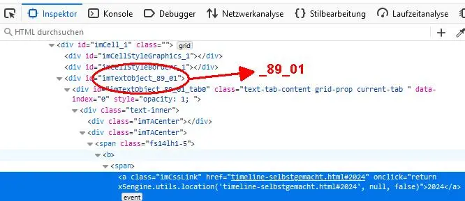 1) Die Zahlen bei #imTextObject_89_01 müssen an die Zahlen des schmalen rechten Text-Objektes auf der eigenen Seite angepasst werden.Diese Zahlen können über den Browser ermittelt werden, z.B. beim Browser Firefox mit der rechten Maustaste oben rechts auf die Jahreszahlen klicken und im Auswahlmenü "Untersuchen" anklicken, dann wird unten das Web-Entwicklerwerkzeug angezeigt und hier finden sich rechts die benötigten Zahl, siehe Screenshot B unten2) Bei Desktopansicht ist die Stickybar berücksichtigt mit einem Abstand (top: 65px) von oben und bei kleineren Auflösungen ohne StickyBar wird der Abstand auf Null (top: 0px) gesetzt.